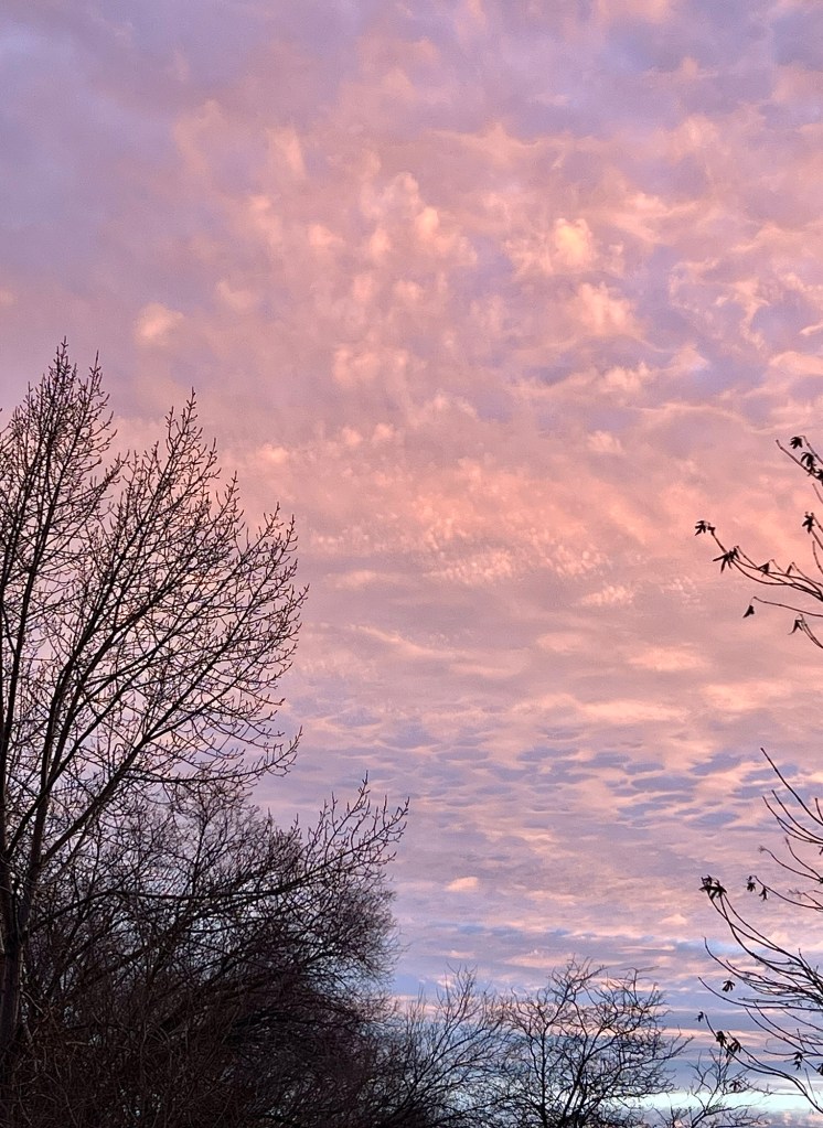 I haven’t joined this challenge before but thought it would be fun. So herewith is my last photo of 2025, completely unedited, a fiery red sunset that is illuminating some wispy clouds through the bare winter branches.