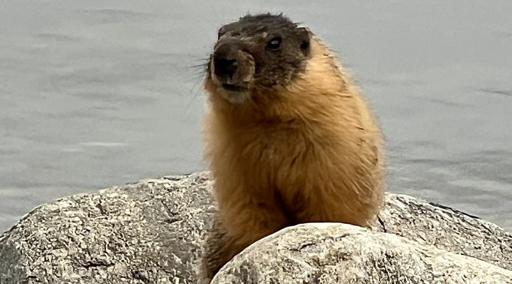 A single marmot has awakened to take a very sleepy peek at whether it’s worth getting up; he looks like he needs a strong coffee!