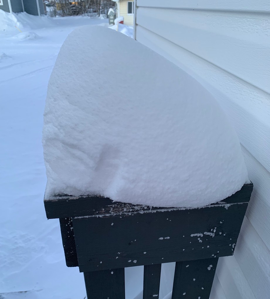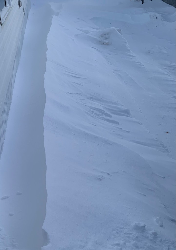 The little indentation on the lower left is where I hit this snow drift with the handle of my shovel.