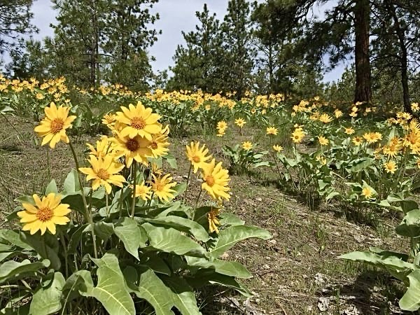 … or mid-April flowers, when the arrowleaf balsamroot, also known as the Okanagan sunflower, begins to bloom. They are profuse, have a beautiful scent, and are a perfect spring start!