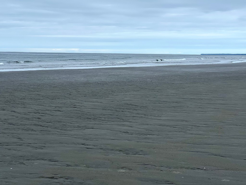 The pictures show North Beach but much closer to Masset. From where I took the picture, there’s an outcropping that hides Tow Hill from view.