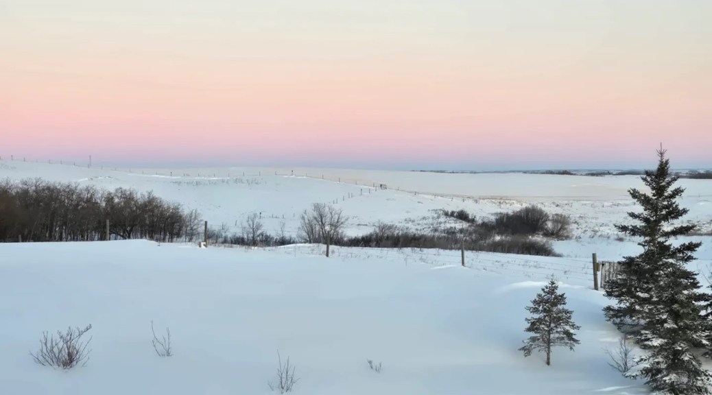 Soft winter sunrise Western sky palette palette pink Means sun will arrive The temperature drops The snowy clouds drift away And there is the sun …