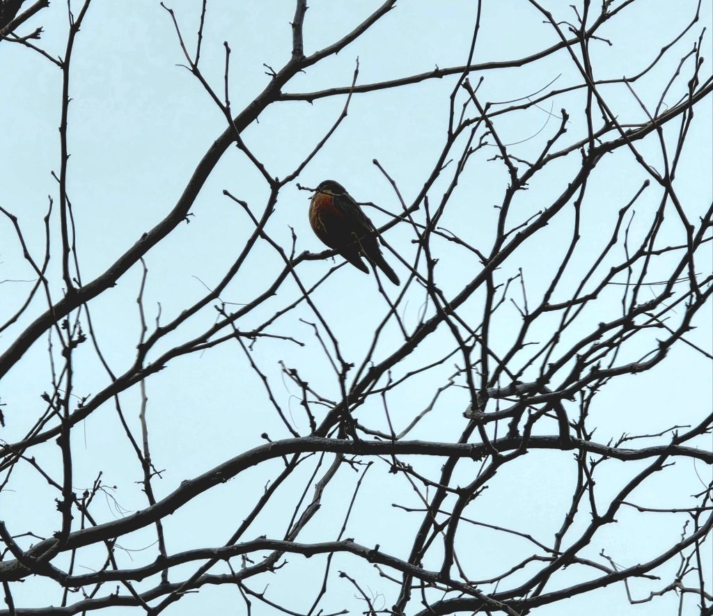 Robins overwinter here but except for very occasional December or January views of them when they stick to the dense thickets and shrubs close to the ground and near their shared winter accommodations, a sight of them is somewhat rare. This one was very active and looking rather springy, too.
