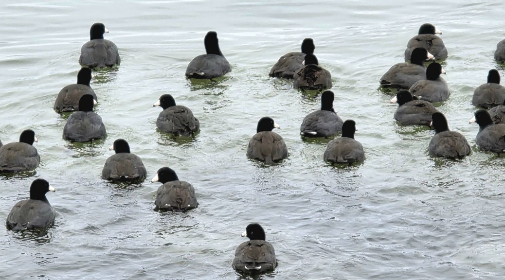 But then I surprised a small flock of coots that were huddled next to the breakwater boulders along the lakeshore. They prefer the smaller ponds up in the mountains, but if those are frozen over, they are forced to move to the much bigger, open lakes. So, like the groundhogs, they might be signalling another six weeks of winter!