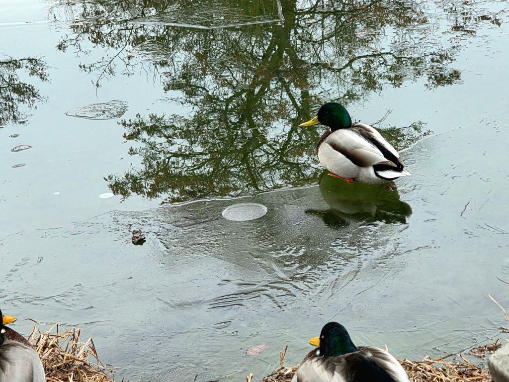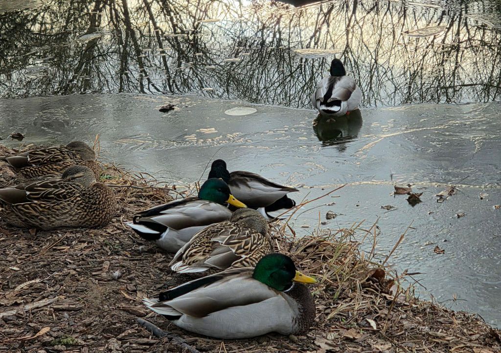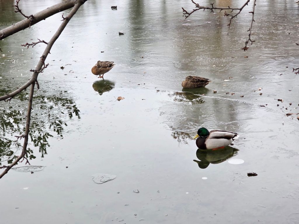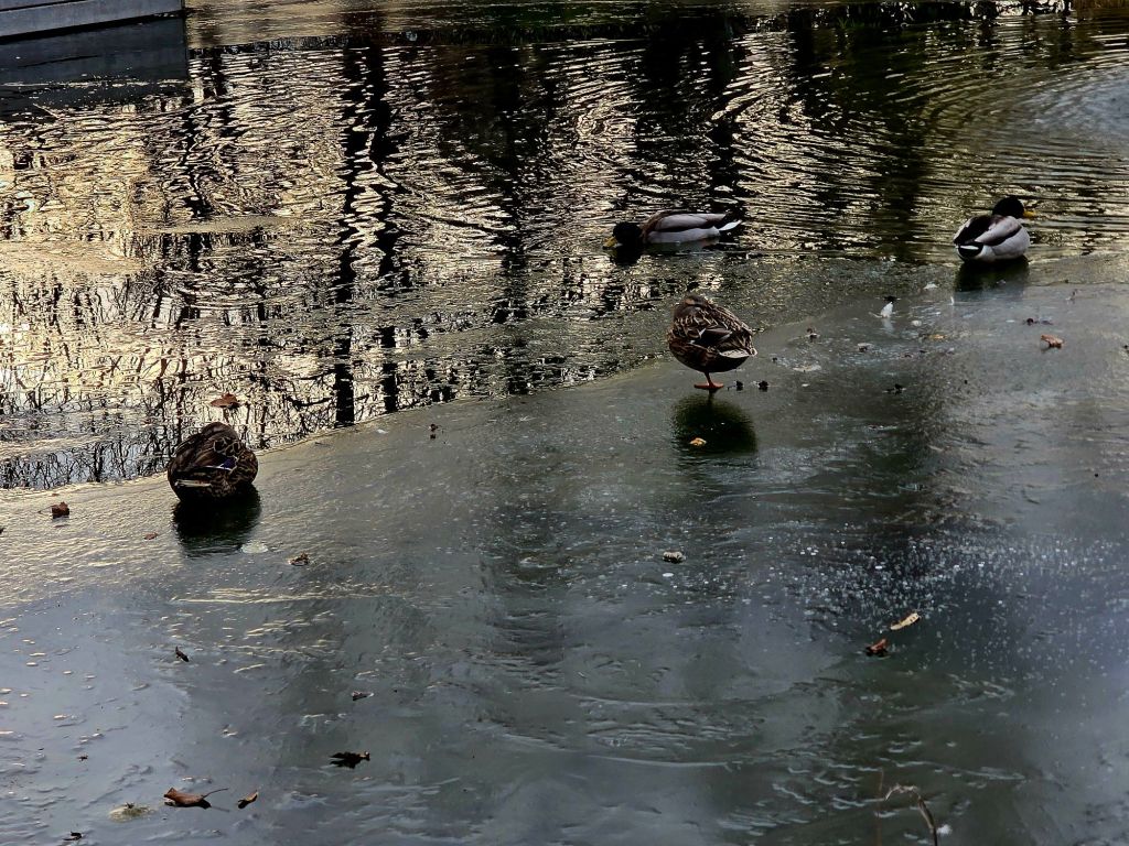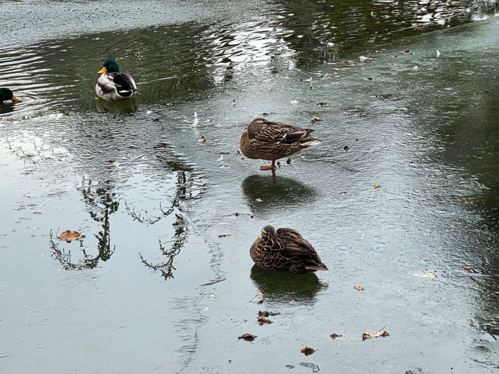 Recently, their favourite little pond partially froze; it had a thin layer of ice in places, but the ducks settled on the icy parts and even napped.