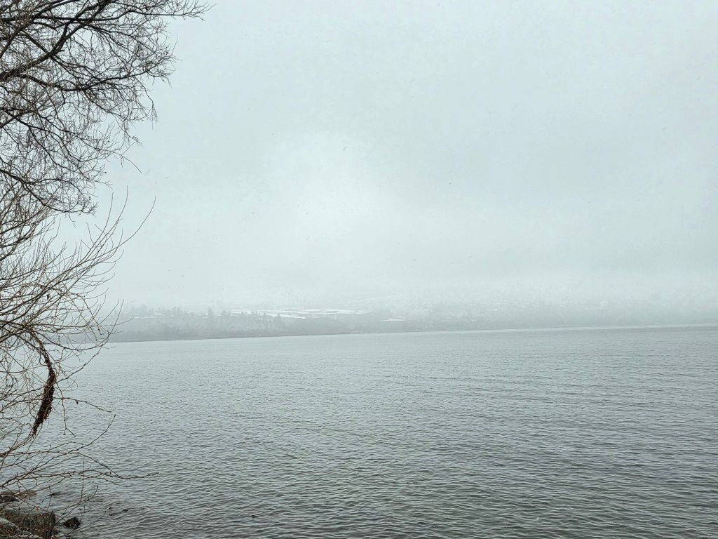 The rainy snow was so dense that the visibility across the lake was quite low.