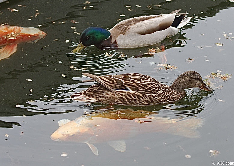 In preparation for nesting, the ducks are busy trying to eat as much as they can and don’t mind sharing with the fish.