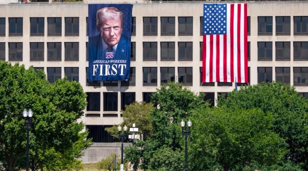 Donald Trump’s giant portrait hangs on the Labour Department headquarters near the Capitol in Washington, on Monday. (Associated Press)