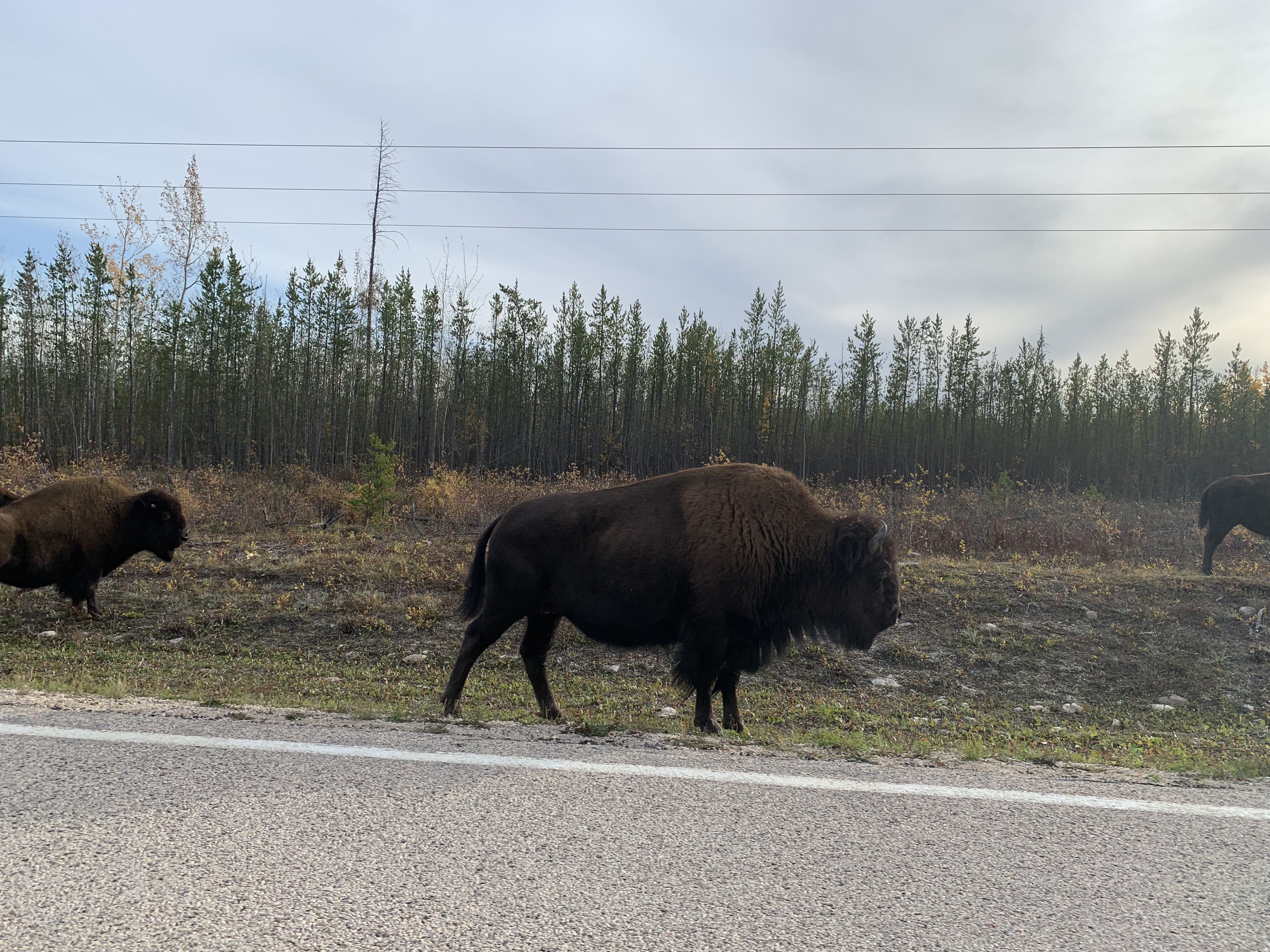 I took these images from a moving vehicle and so the quality isn’t great, but we didn’t want to stop in the middle of a herd like that. Bison have been known to charge a car or truck, and despite their size, they can move quickly. Many of them (these are wood bison) are 1000 kg (about 2200 pounds), so I really wouldn’t want one headed my way.