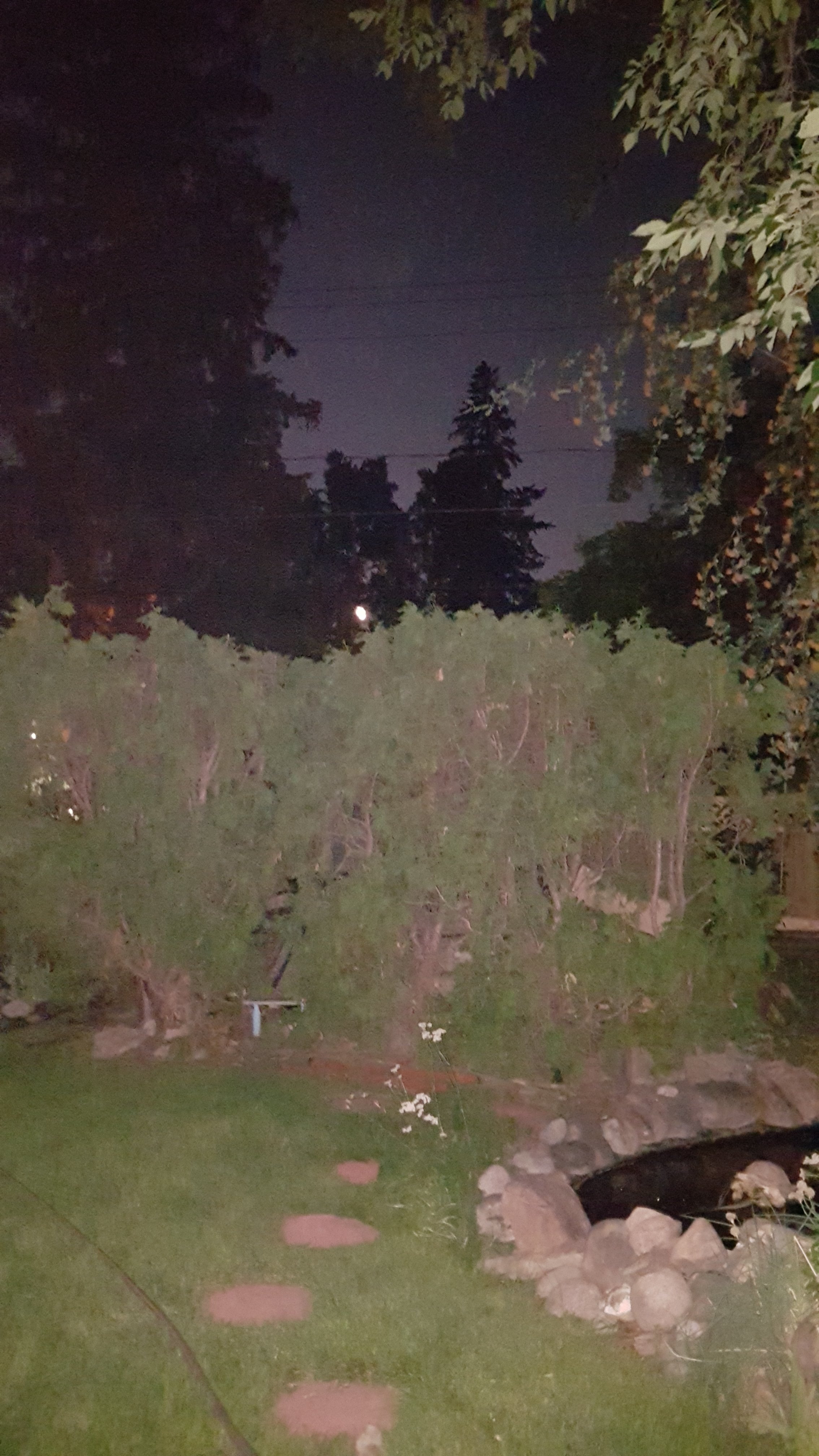 She has many beautiful, mature trees, a small pond, and a vegetable patch.