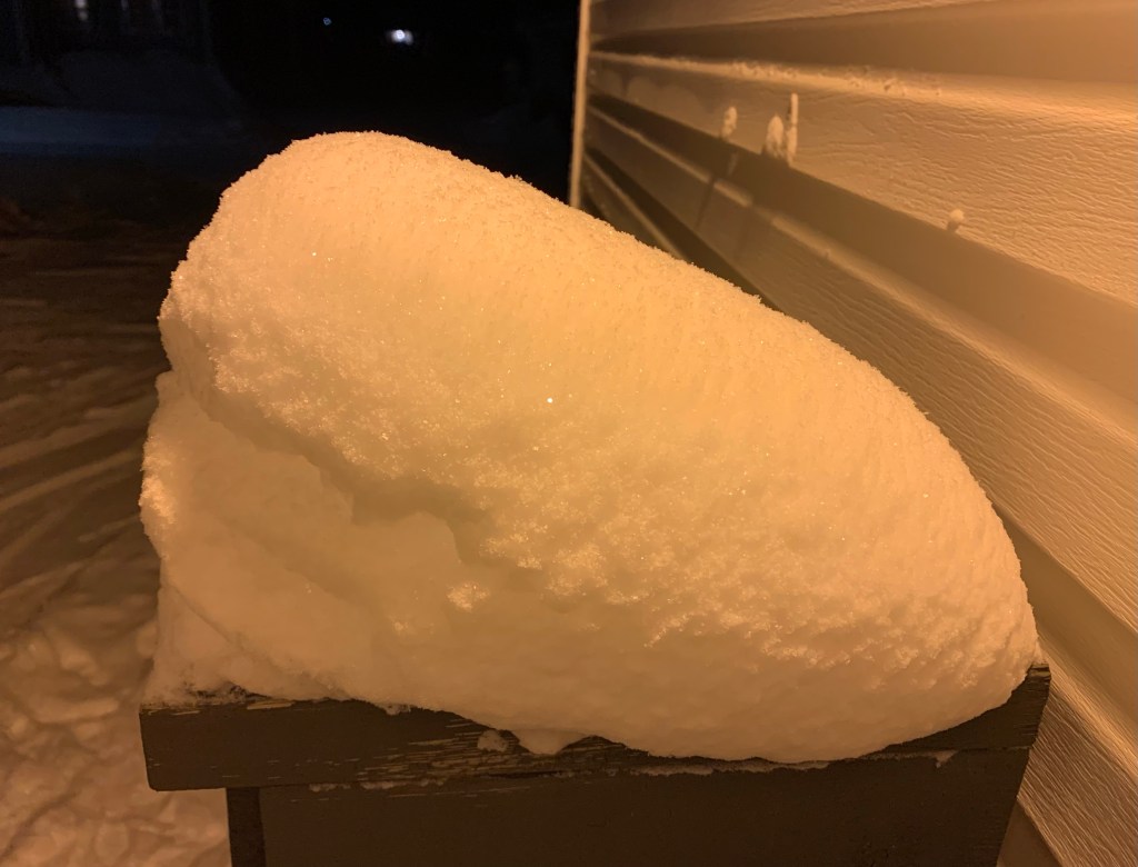 Here’s the snow accumulation on the step railing outside my door. I’ve been letting it pile up to see how high it can get.