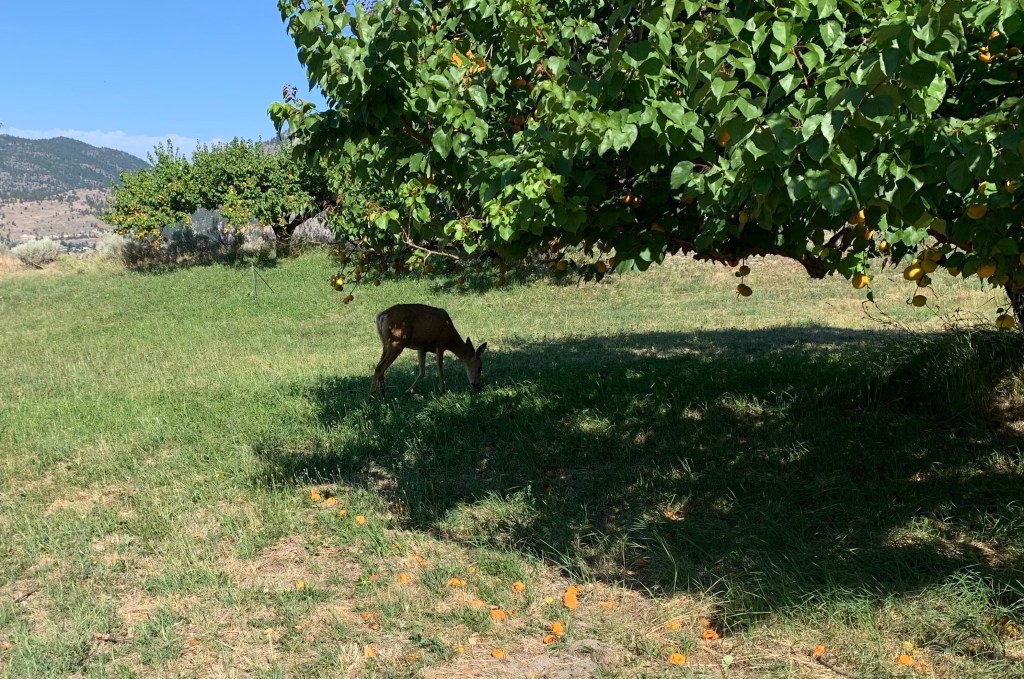 I came across this deer chowing down on apricots. There were three trees in the field, all of which have very ripe and seemingly abandoned fruit. He didn’t seem much bothered by me as I stopped to admire the scene.