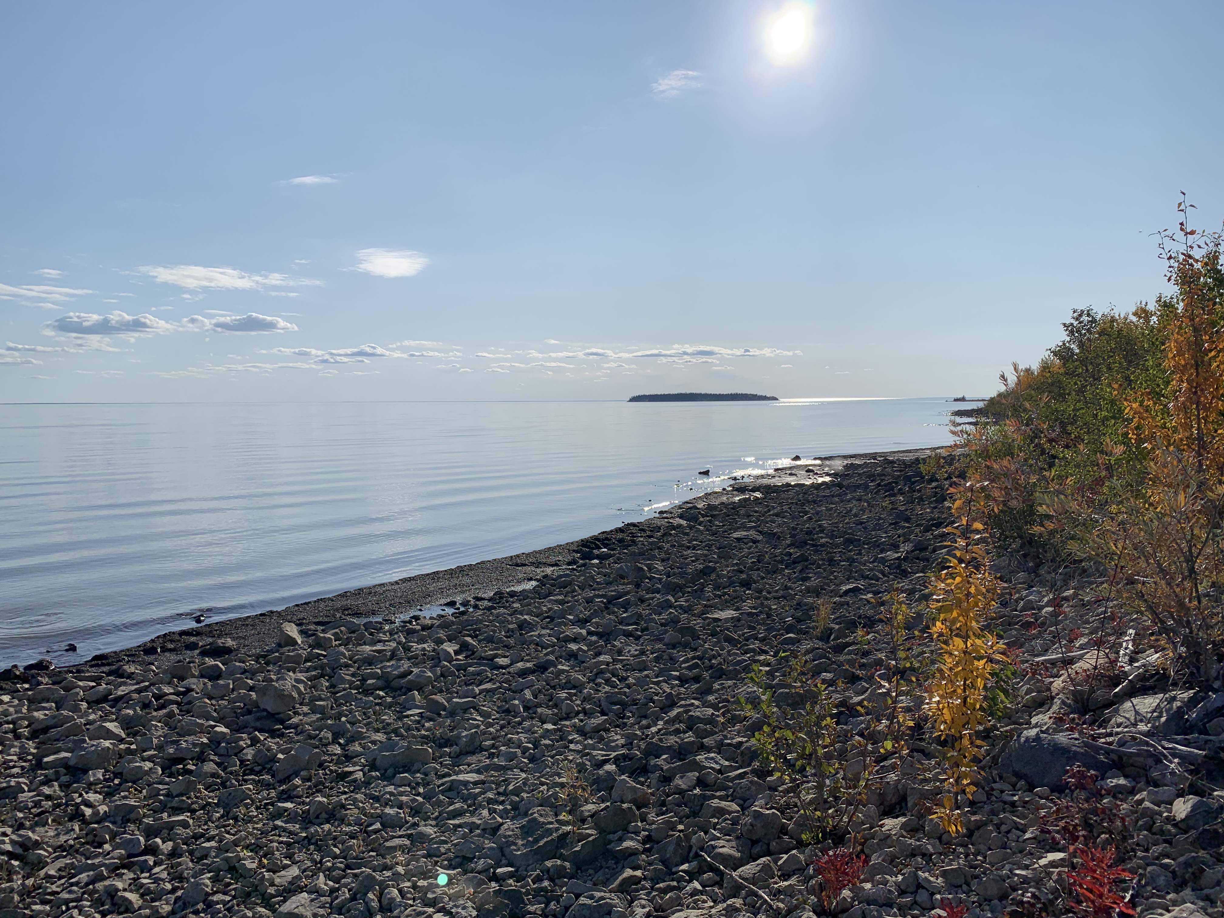 On a recent warm day I went for a walk on the shores of Great Slave Lake. This is a huge lake (tenth largest in the world) and is not usually this calm (unless it’s frozen 😉 ).