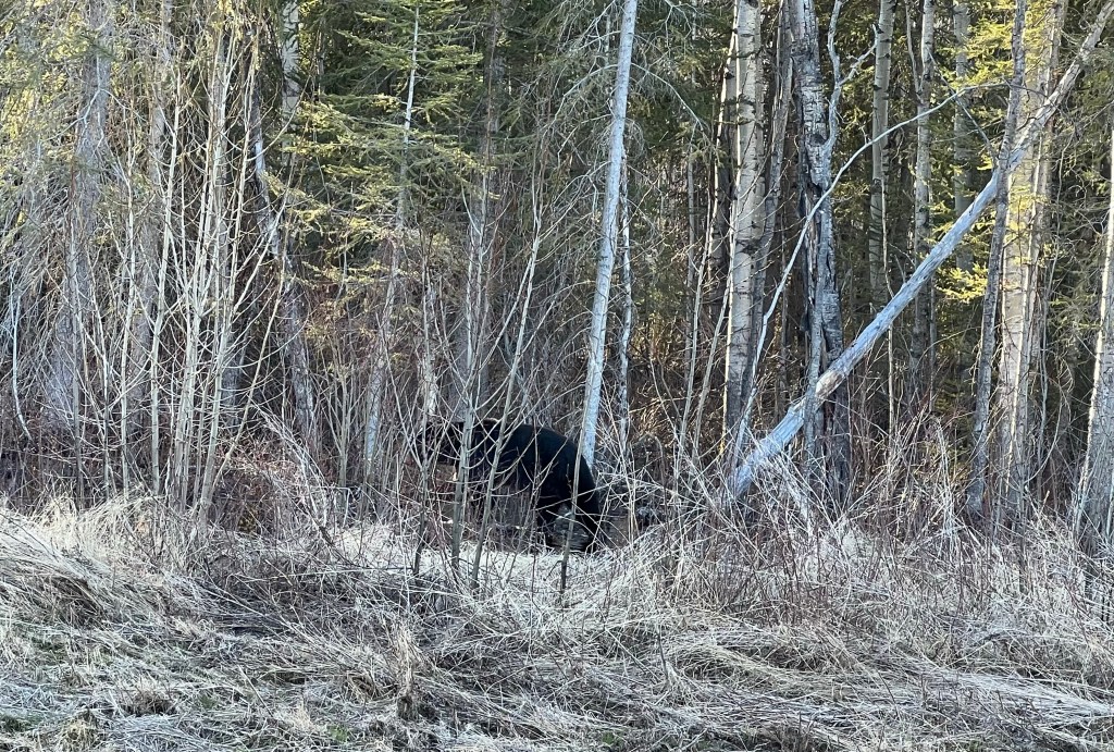 We were careful and stayed in our vehicle but we did enjoy observing him. This yearling was eating a plant that he seemed to like a lot but also appeared to be very sleepy. This far north (60° north latitude) the bears haven’t been awake from their winter slumber for very long.
