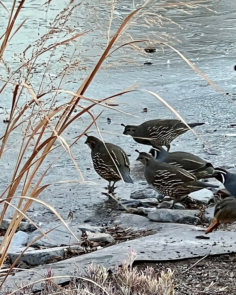 The little Okanagan Valley quail test out a newly frozen pond.