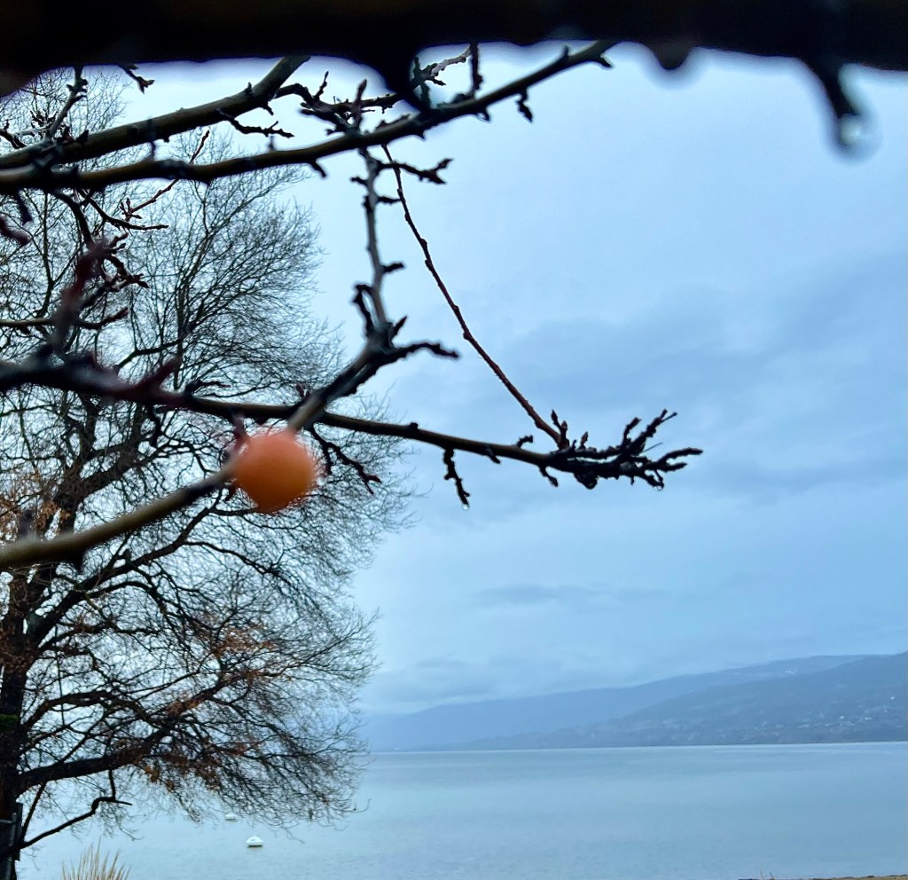 The view across the lake was very, very overcast but also windless which was a nice thing. The above picture shows a small crabapple in the foreground. I was surprised to see several of them; usually the birds have eaten them by now. They look a bit like tree ornaments.