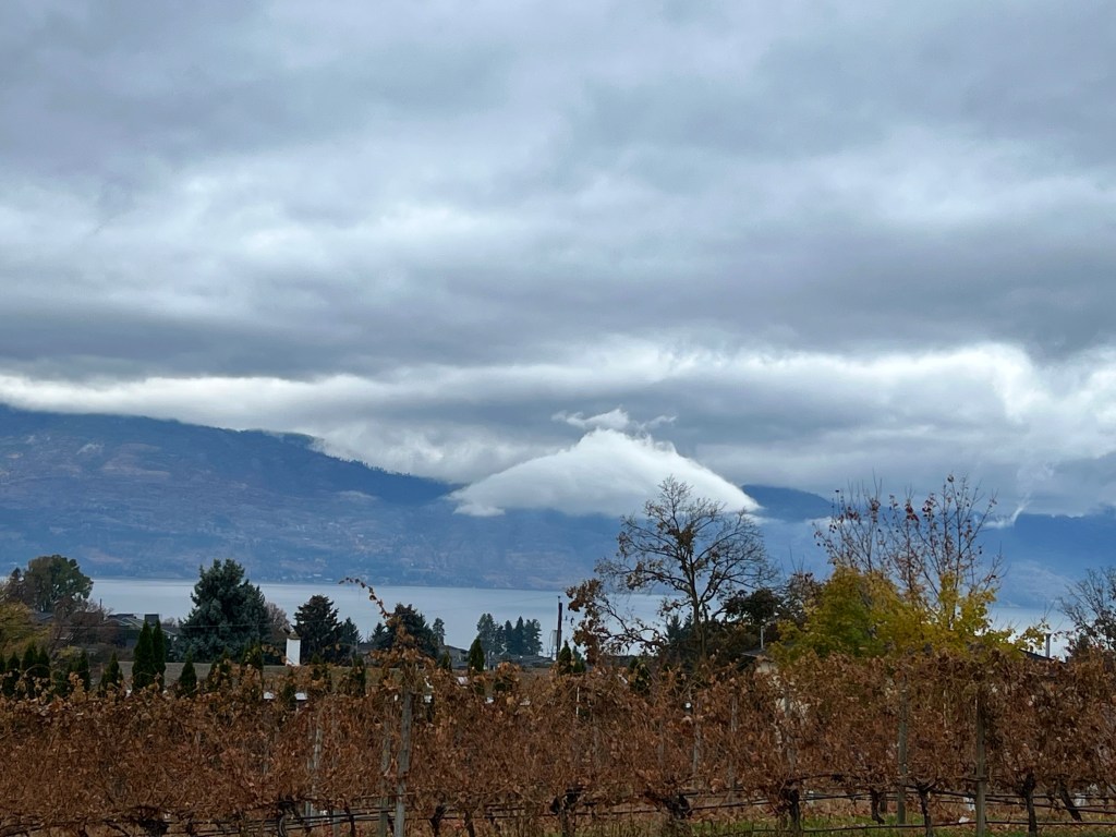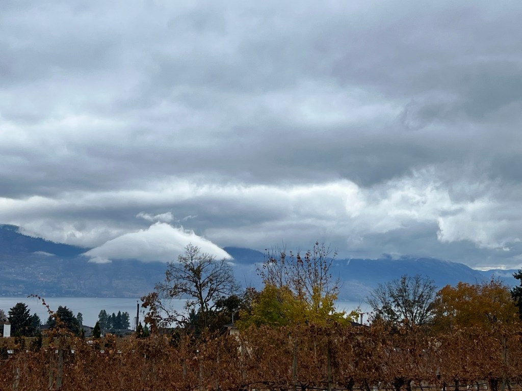 Penticton’s elevation is 385m (1263 ft) and the mountains around us are at least another 700m (2300 ft) higher; mist and cloud are typically trapped by mountain ranges.
