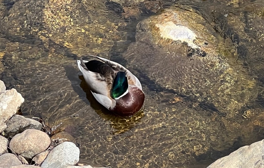 The ducks are happy again! Their favourite creek is now flowing at its normal levels, they have mated and moulted, and the rest of their summer will be pretty easy. The photo above shows male ducks; that’s because the mums have all the young ones down by the lake to hang out with the geese.