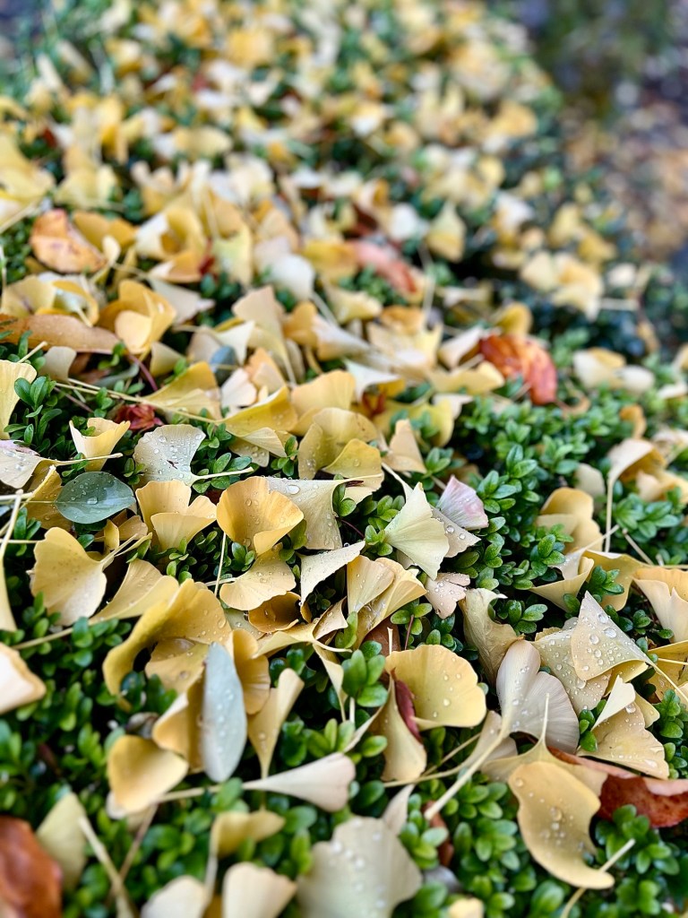 A faded ginkgo biloba leaf is caught in the barberry shrub, making for a lovely colour counterpoint.