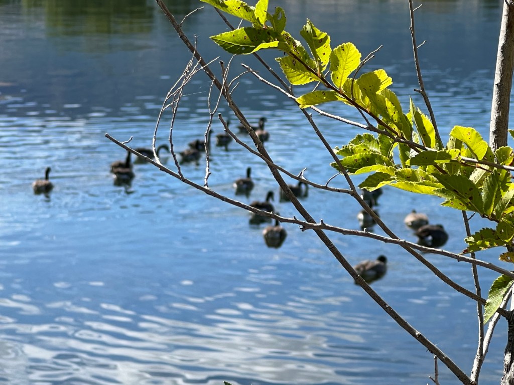 Canada geese mate for life and are very much equal partners, taking turns guarding, sitting on the nest and feeding the little ones. In the case of the pair above, one was guarding while the other was eating, but I couldn’t tell which was which. One thing I could tell though was that the guarding goose was giving me the stinkeye!