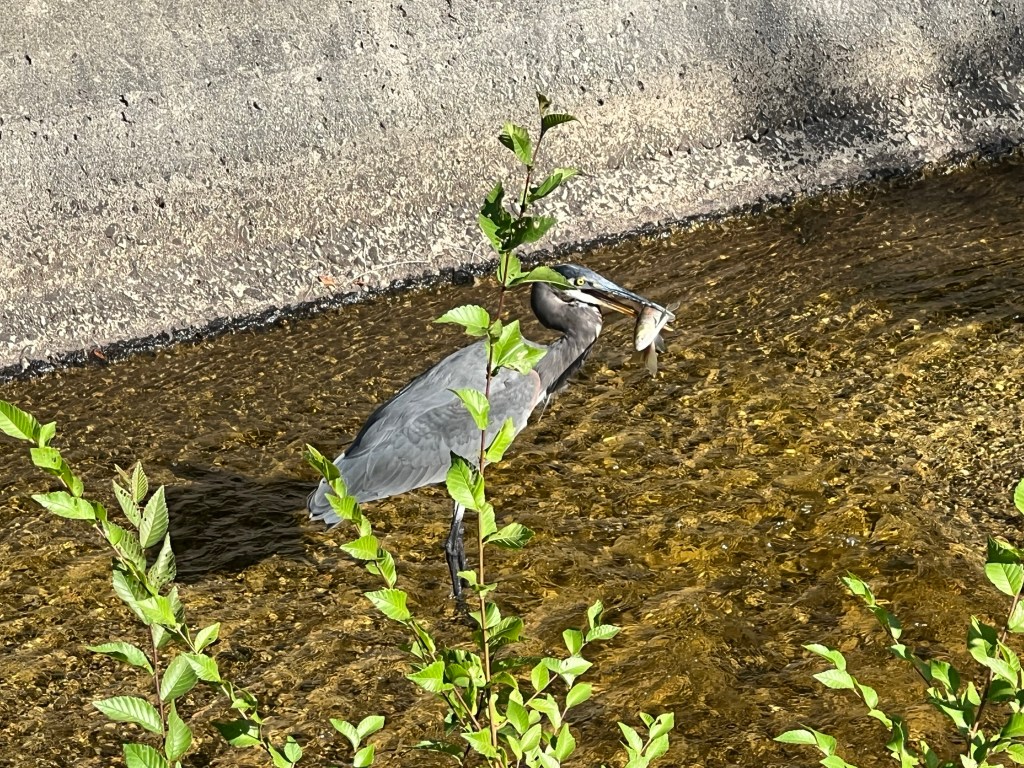 The kokanee (a landlocked type of salmon) are starting to make their way upstream for spawning, and Mr Heron had his eye on one.