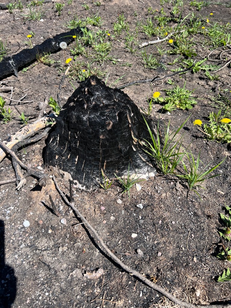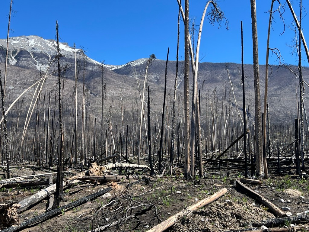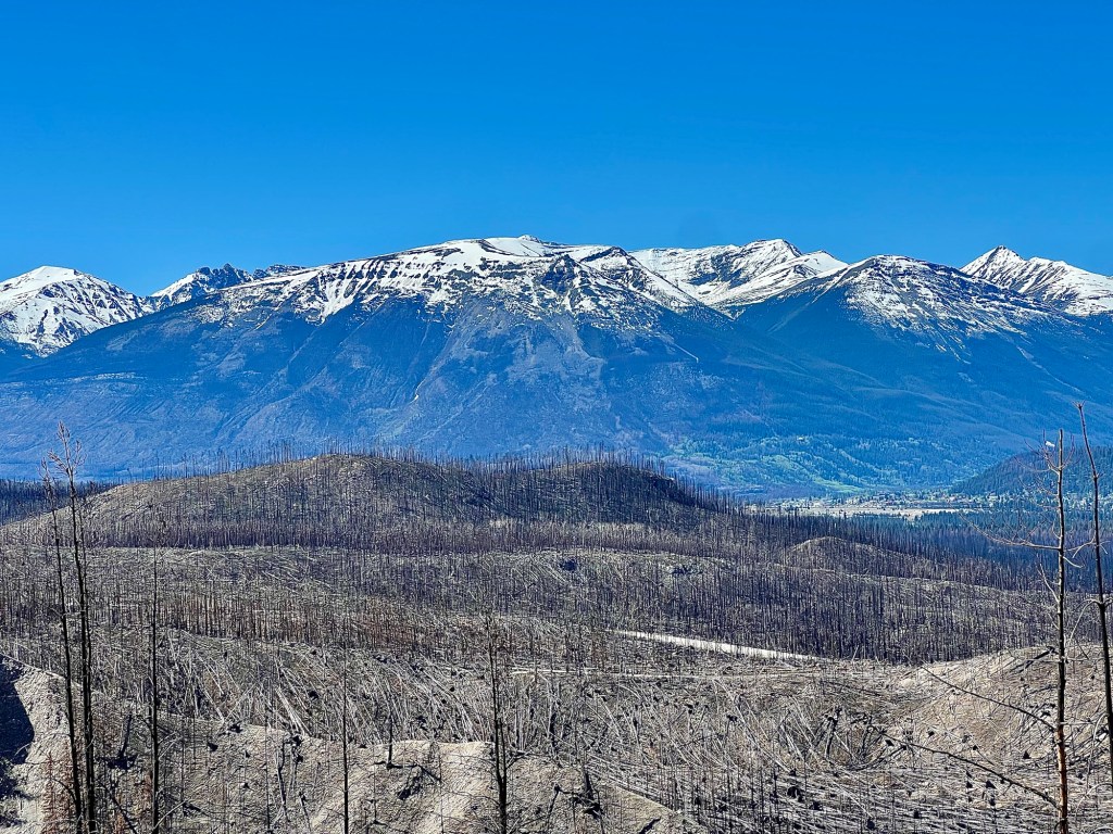 This photo gives a sense of how far the fire extended as well as a contrast with the healthy forest in the background.