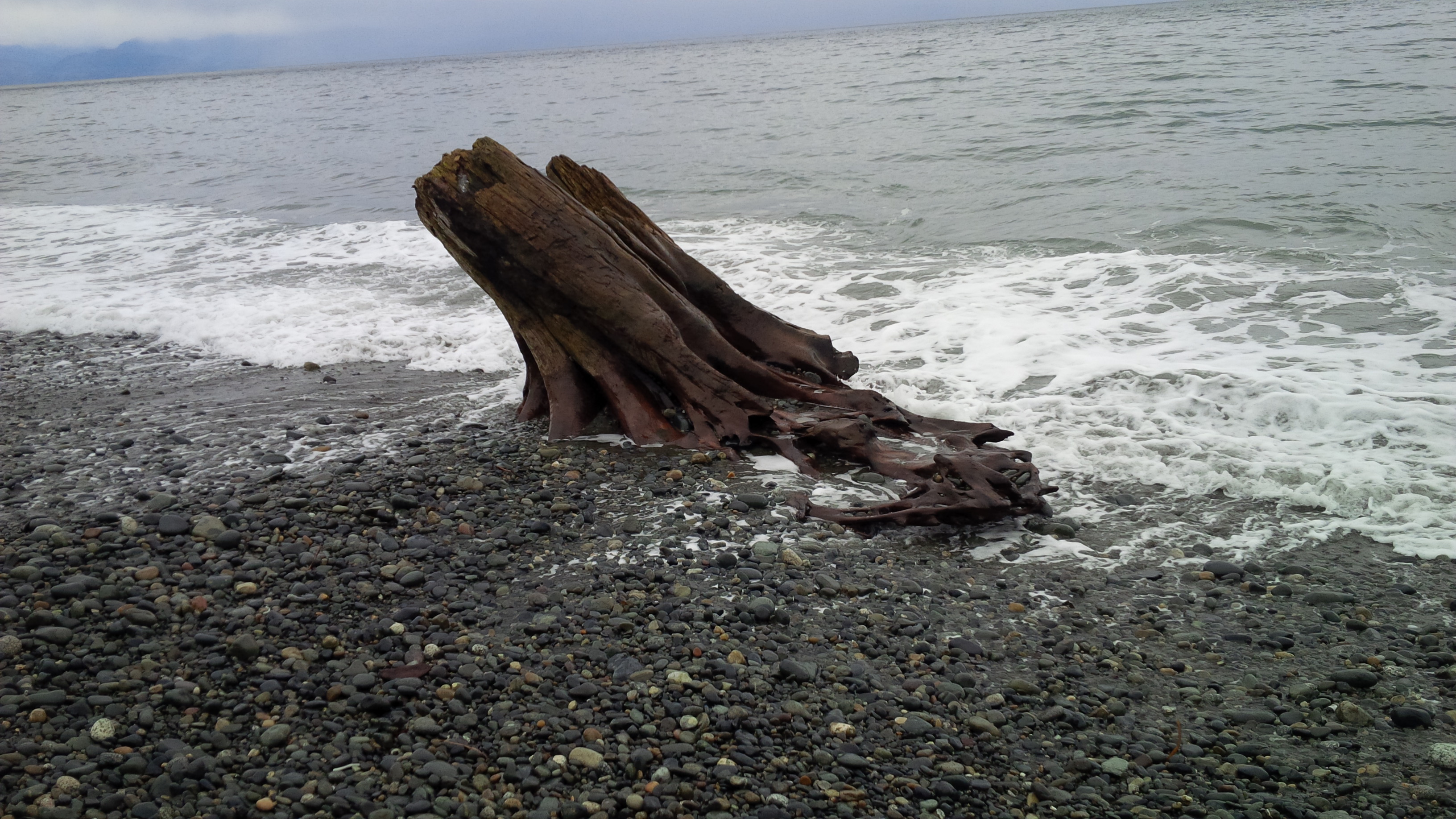 The tree itself must have been very old and very magnificient before it died and its remains were washed into the sea. I couldn’t count the rings because of the surf and also because of how worn it is, but I could see many of them, perhaps a hundred. It’s still magnificient, still standing up to the elements that will eventually take it completely.