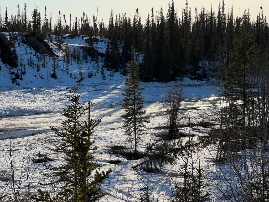 A week ago, this river, jammed with ice and swollen by a massive rain and snow storm, burst its banks. The muddy-looking chunks toward the left are actually the leftover pieces of some of the enormous ice pans that clogged the river.