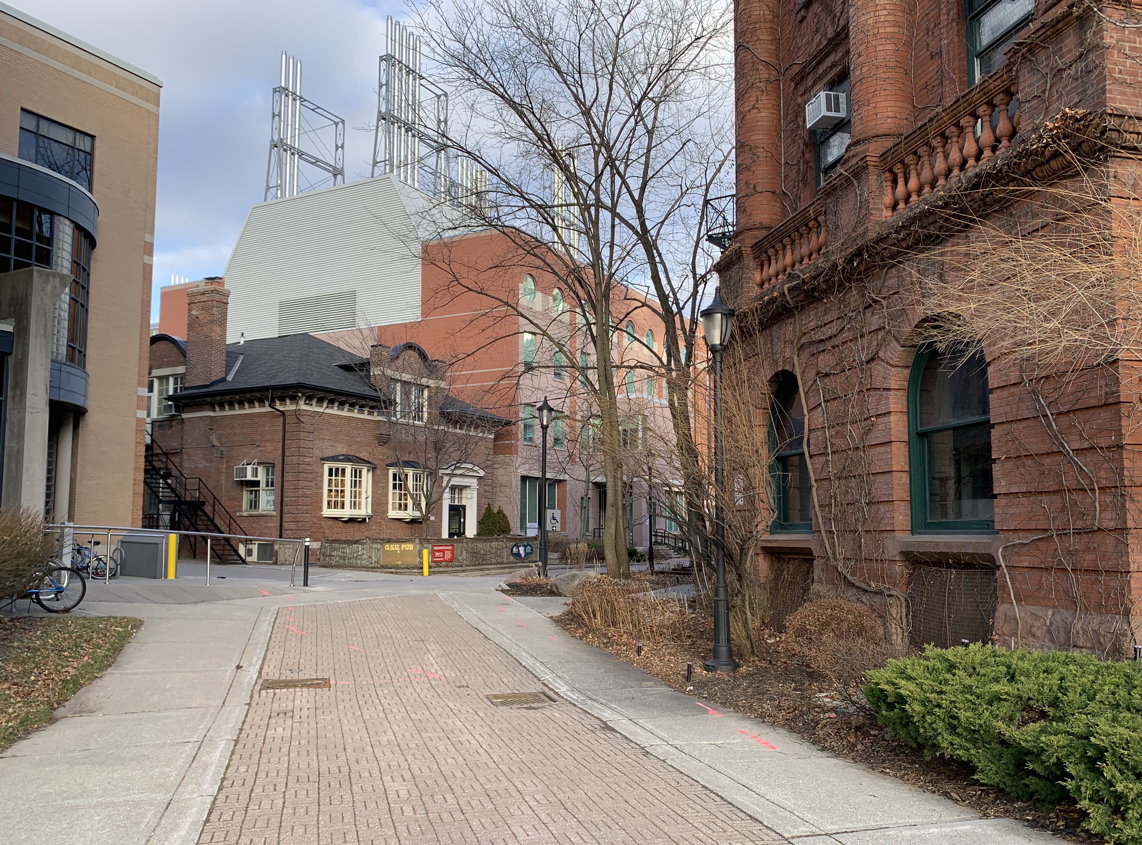 The blue and grey building is the AGO’s exterior, again juxtaposed against a much older building. The plain wall was being prepped for an art display.