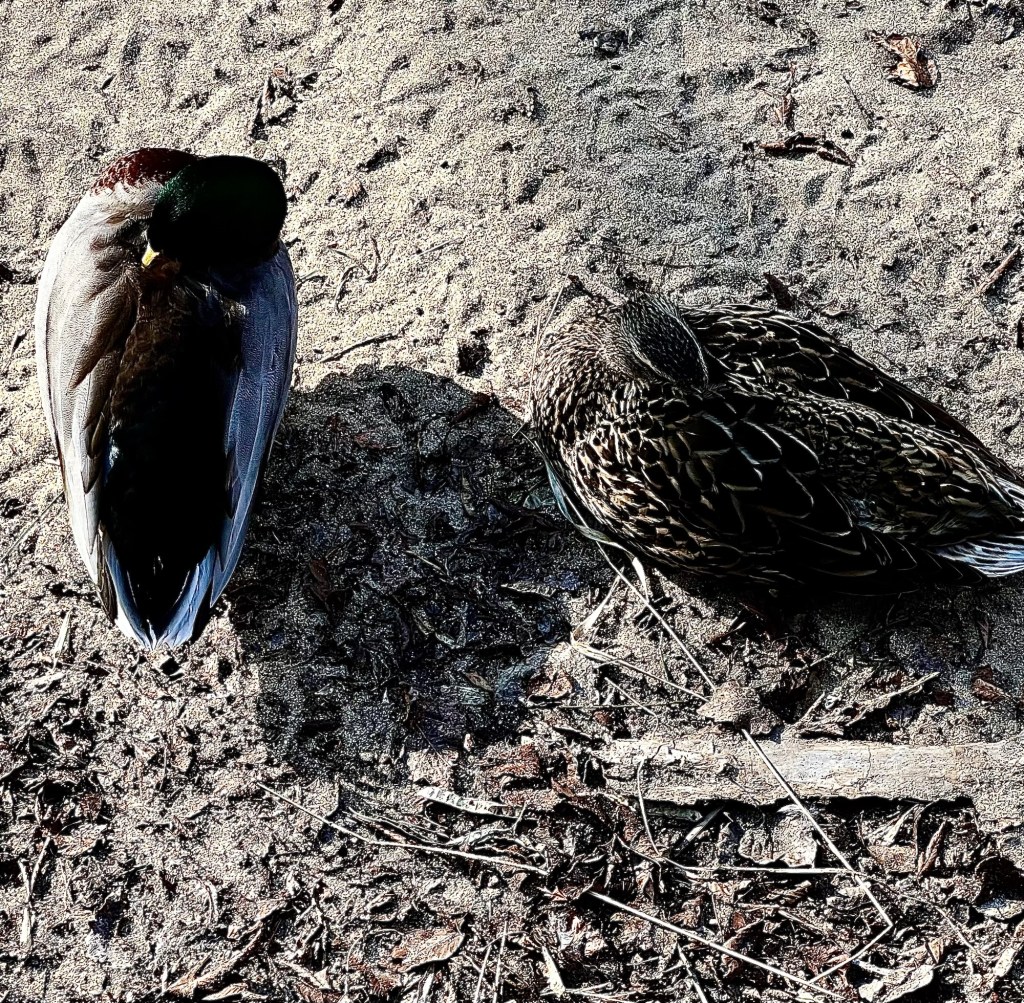 Community garden flowers. Napping mallards. Blue sky buds. A great view …… and a coffee. 😊