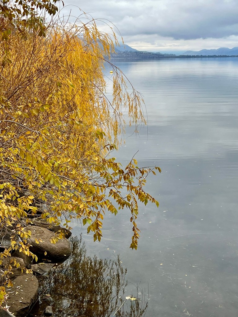 If you look straight down the lake toward the low mountain at the other end, you can see some higher elevation snow. As a result, the overcast, while not my favourite weather pattern, definitely has some advantages hidden in its silvery clouds.