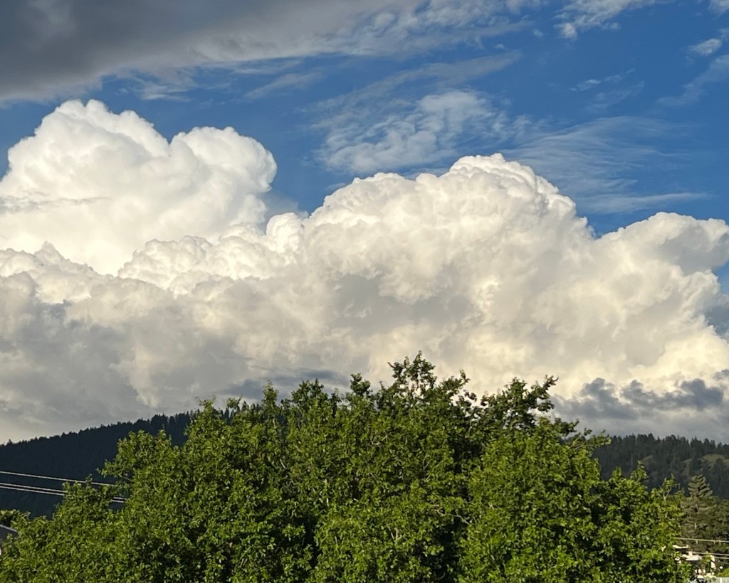 These pretty cotton-ball clouds arrived on the horizon while I was enjoying some deck time. Although they look harmless, cumulonimbus clouds can pack a very serious wallop, especially if they get together in a group or start growing vertically. These clouds are doing both, and a bit later we had an enormous thunder storm.