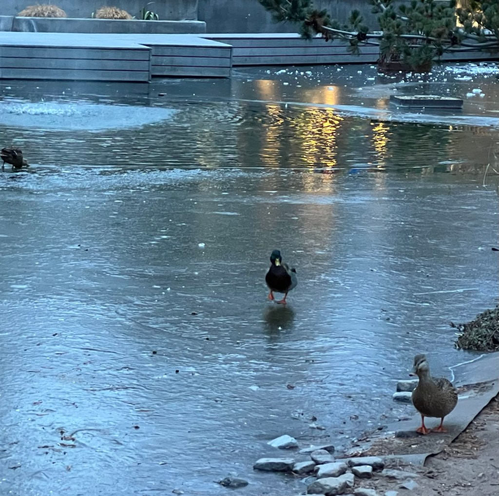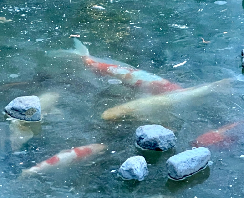 I was surprised to see the carp swimming around under the frozen surface. Someone had thrown rocks at the pond’s surface, trying to break the ice, but it’s frozen enough to hold. The fish look surreal under the rocky ice layer!