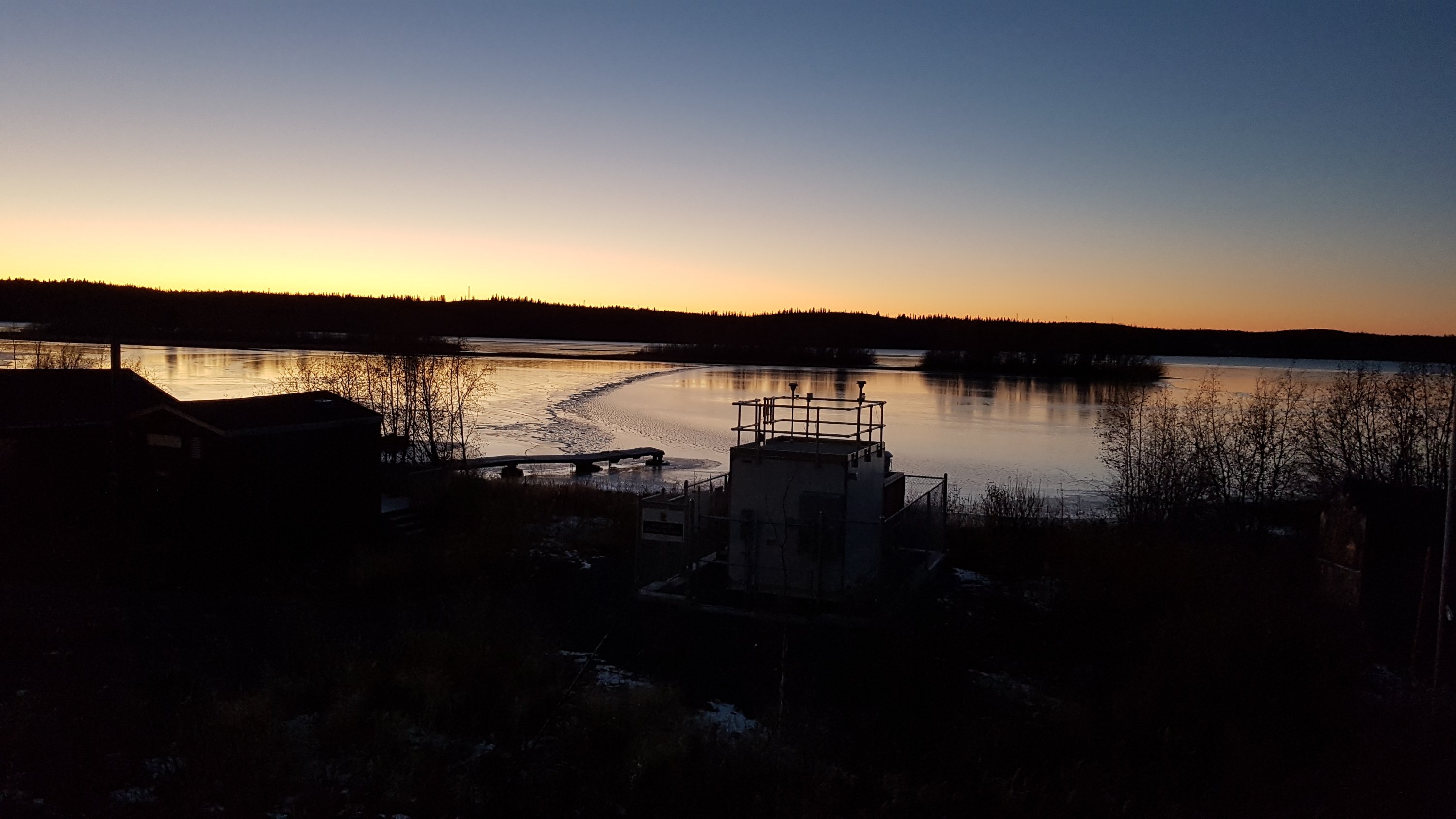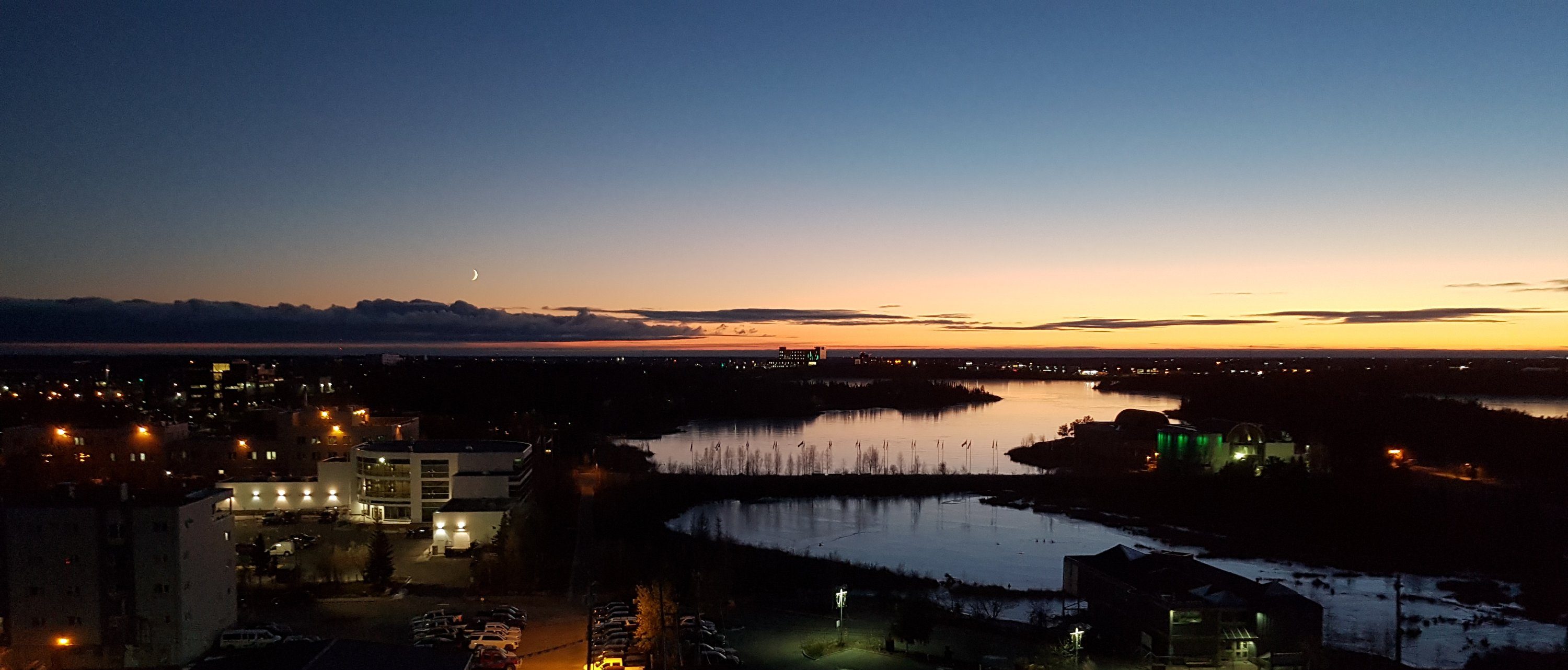 This photo shows a recent overcast day at a small lake just outside of Yellowknife. To me, the landscape is iconically northern-looking with much evidence of the Canadian Shield covered by short trees. Clear ice is also forming on this pond. Probably enough to walk on, but I wouldn’t take the chance yet.
